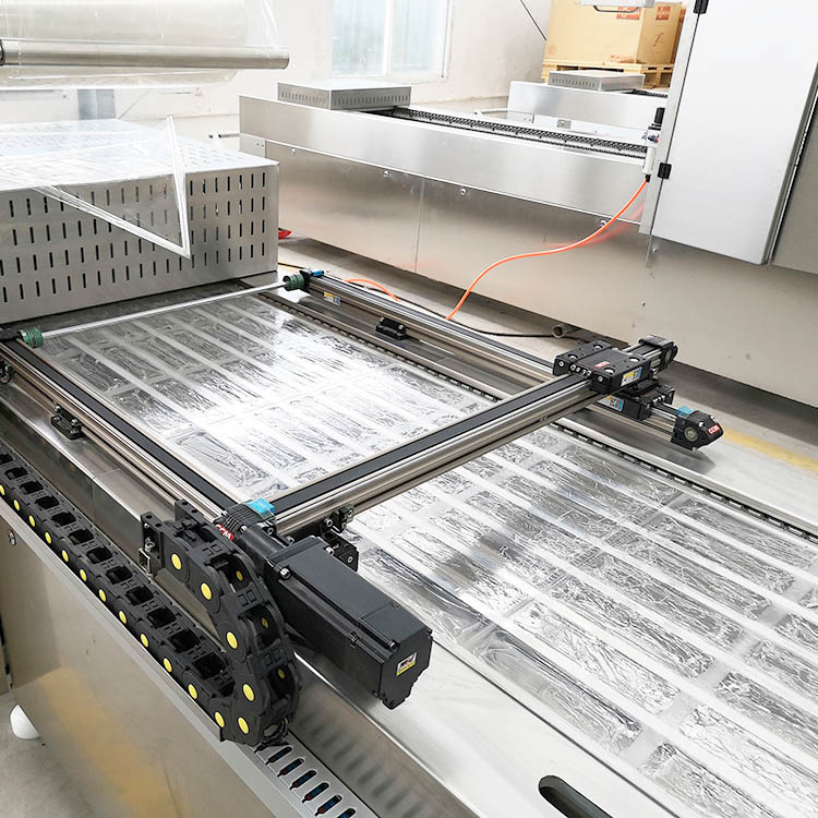 雙面拉伸膜真空包裝機工作原理是先將產品放在托盤里,再將托盤放入設備的放料區,托盤隨著鏈條的向前運行進入到封口模具里,模具上升,在封口模具里將上膜附在托盤上,先抽真空、(可根據用戶產品包裝要求,在抽真空的基礎上,充氮氣或混合氣體進行包裝)封口、(上膜和托盤封在一起)沖切,后排氣,降模,包裝好的產品隨著鏈條繼續向前運行,從出料口出料。設備還附加了光電跟蹤對齊彩膜系統,為用戶節約成本,提高生產效率,提高包裝檔次。配置廢棄邊料回收系統,保持環境衛生。還可以根據用戶產品包裝要求,配備自動打碼系統或者噴碼系統。